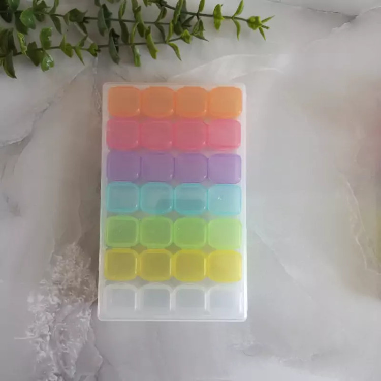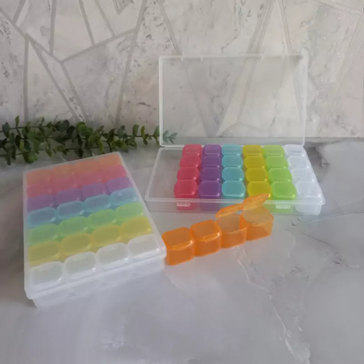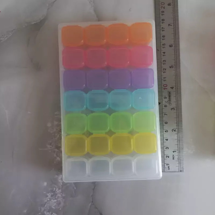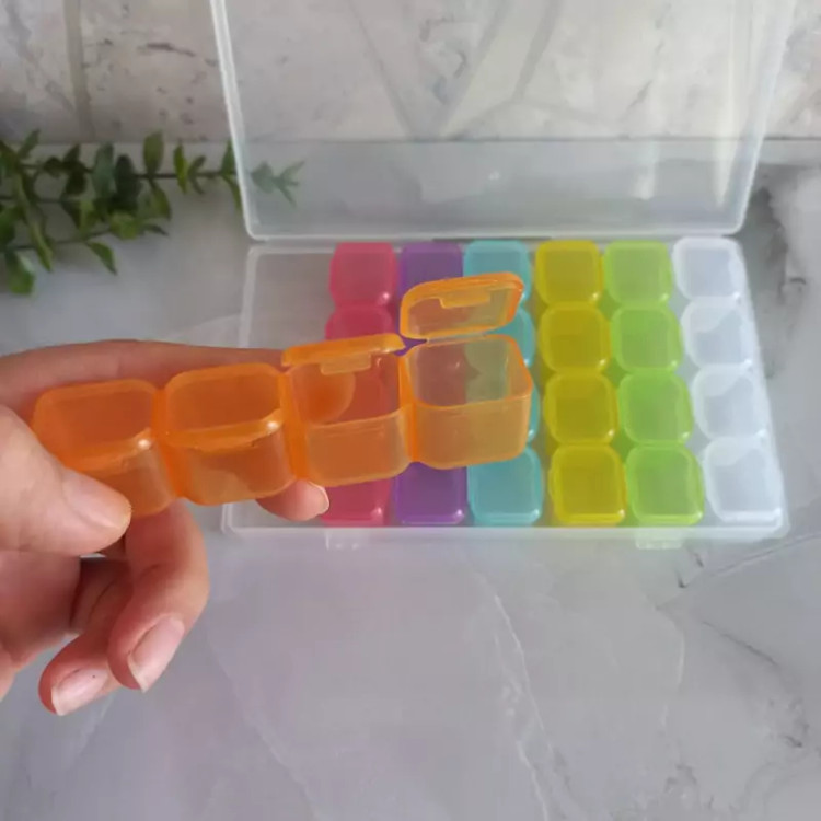 جعبه نظم دهنده 28 خانه هر ردیف 4 تایی بهم وصل هستن ،هر خانه درب جدا داره که کیپ میشه،برای خرد ریز های هنری مثل اکلیل ،فیمو،حلقه ها،پودر ها